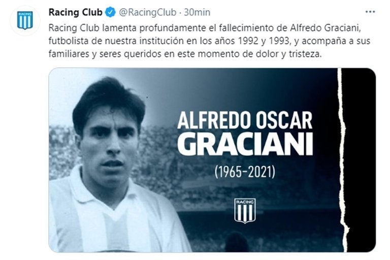 Obviamente las cuentas oficiales de Boca también despidieron a Graciani con un sentido mensaje: “Boca Juniors despide con dolor a Alfredo Graciani, delantero que marcó una época en la década del 80 con sus 250 partidos, 83 goles y 2 títulos. El club acompaña a sus familiares y amigos en este triste momento. Hasta siempre...”. Y Racing, entidad por la que el Murciélago también pasó, replicó: “Racing Club lamenta profundamente el fallecimiento de Alfredo Graciani, futbolista de nuestra institución en los años 1992 y 1993, y acompaña a sus familiares y seres queridos en este momento de dolor y tristeza”.