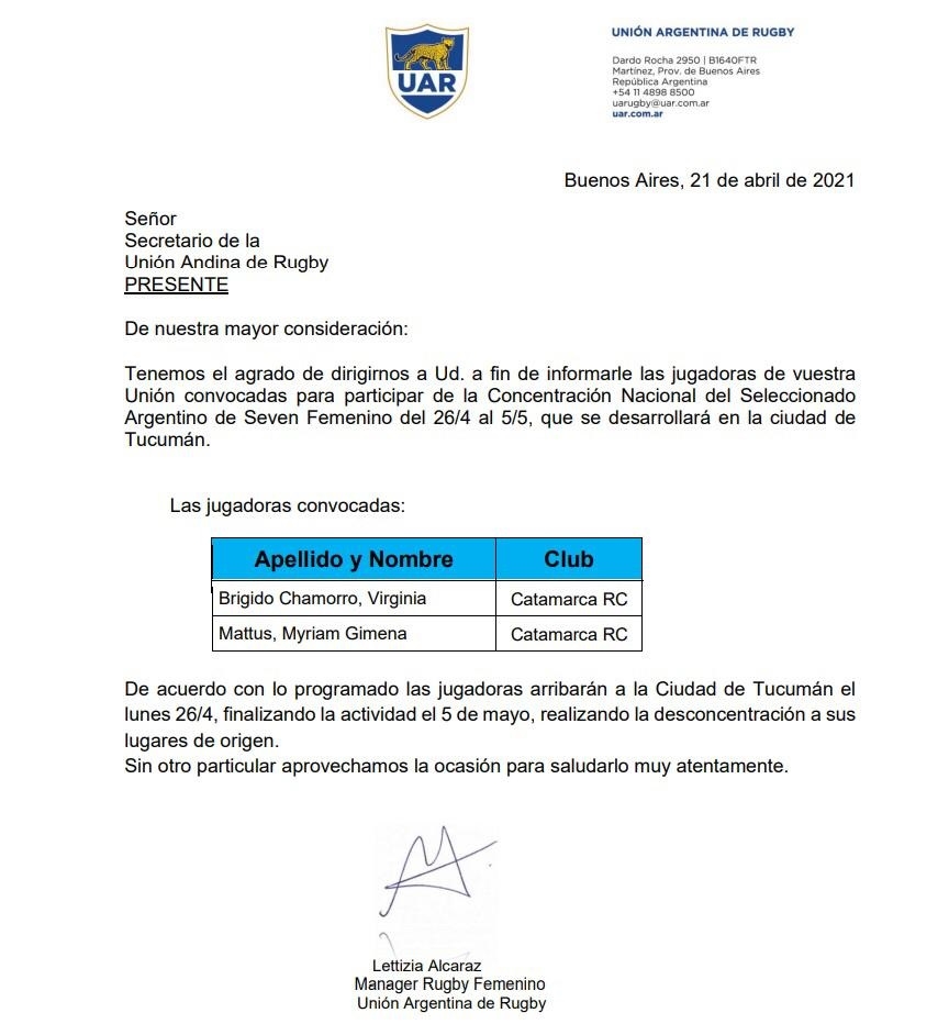 En la misiva se precisa que de acuerdo a lo programado “las jugadoras arribarán a la ciudad de Tucumán el lunes 26/4, finalizando la actividad el 5 de mayo, realizando a la desconcentración a sus lugares de origen”.
