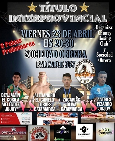 El evento es organizado por Chunay Boxing Club y Sociedad Obrera, y prevé ocho peleas de complemento.