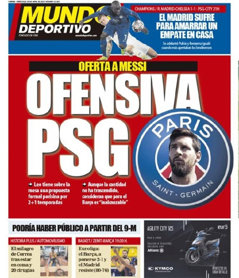 Según informa Mundo Deportivo en su portada, el París Saint-Germain (que afronta las semifinales de la Champions League) ya le presentó al rosarino una propuesta formal de un contrato por dos temporadas, con la opción de extenderlo por una más.