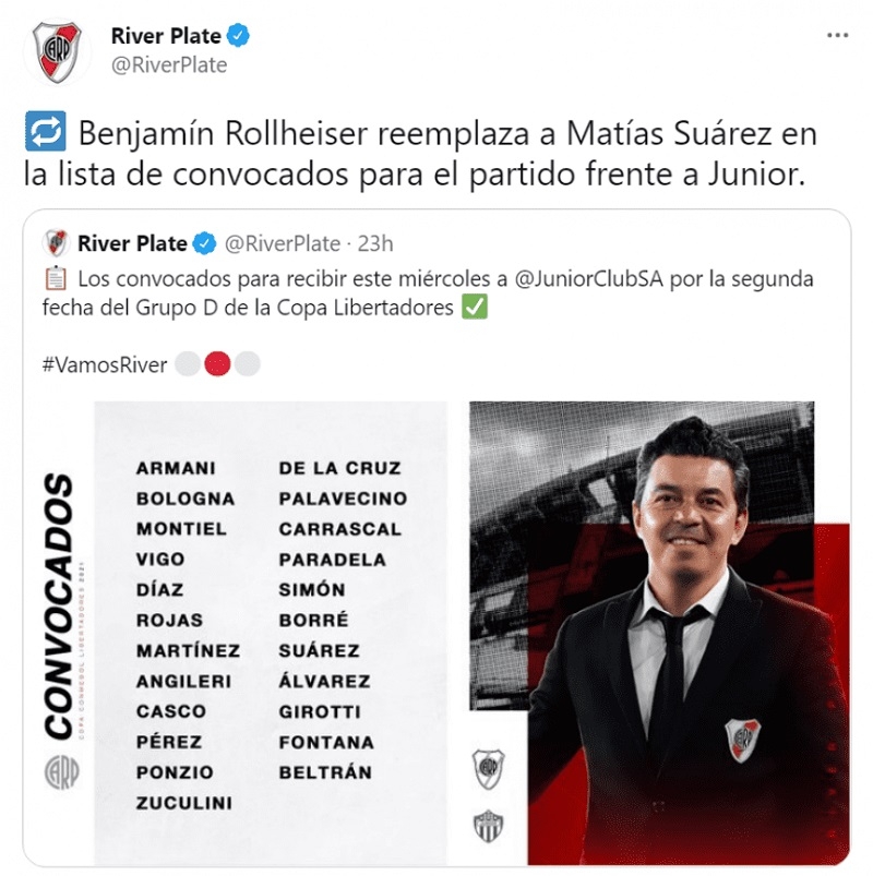 Desde sus redes sociales, River confirmó que será Benjamín Rollheiser quien reemplace a Matías Suárez en la lista de jugadores convocados para enfrentar mañana a Junior, por la Copa Libertadores.