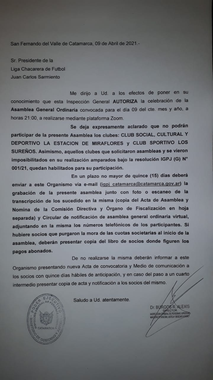 “La Inspección General de Personas Jurídicas AUTORIZA la celebración de la Asamblea General Ordinaria convocada para el día 09 del corriente mes y año, a las horas 21, a realizarse mediante plataforma Zoom.