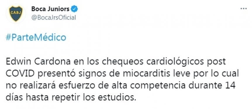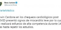 Edwin Cardona presentó signos de miocarditis leve en los chequeos cardiológicos que se le realizaron luego de haber padecido Covid-19. El jugador de Boca no podrá realizar esfuerzo de alta competencia durante 14 días y luego deberá repetir los estudios.