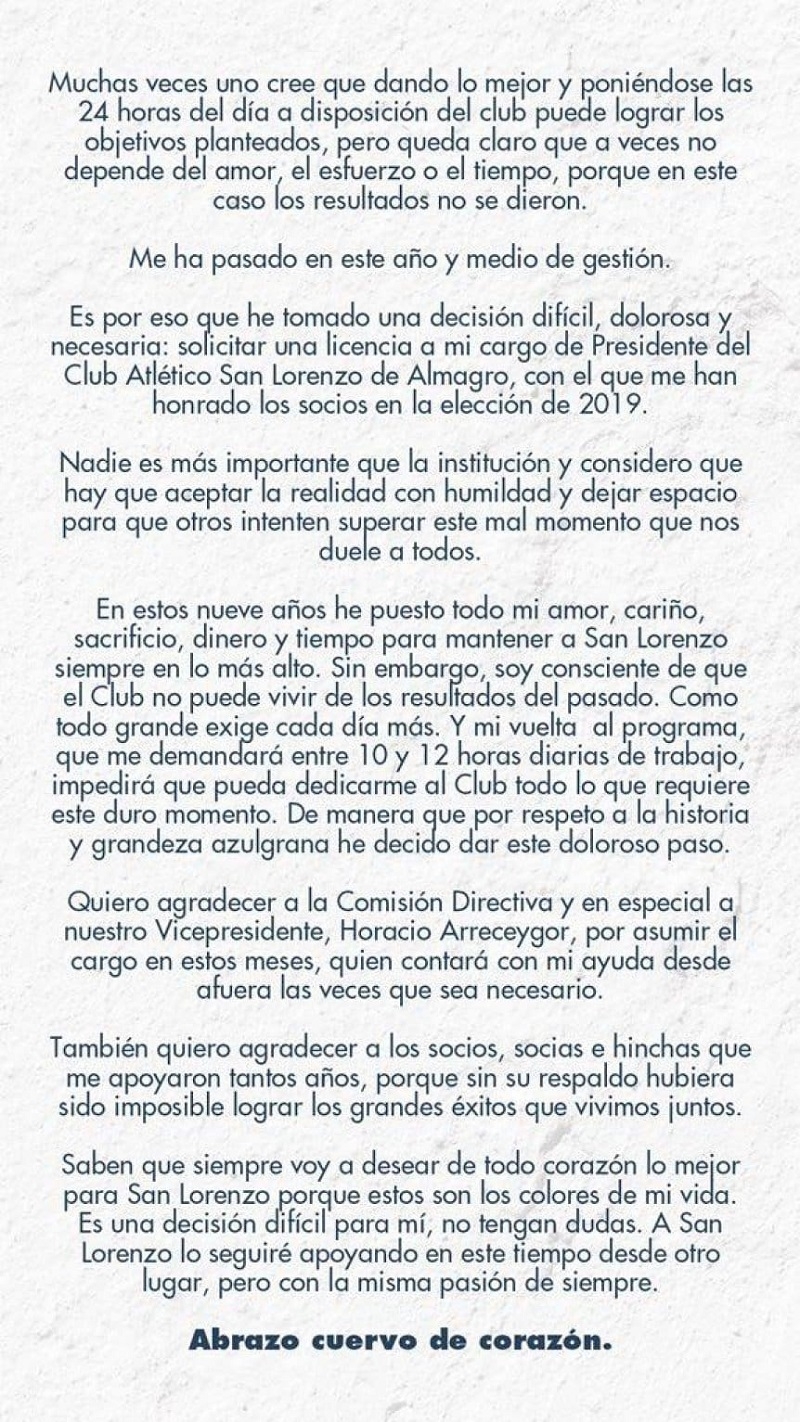 "He tomado una decisión difícil, dolorosa y necesaria: solicitar una licencia a mi cargo de Presidente del Club San Lorenzo de Almagro, con el que me han honrado los socios en la elección de 2019", expresó el conductor televisivo, sin dar precisiones respecto de la duración de la licencia solicitada.
