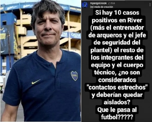 "Si hay 10 casos positivos en River (más el entrenador de arqueros y el jefe de seguridad del plantel) el resto de los integrantes del equipo y del cuerpo técnico, ¿no son considerados 'contactos estrechos' y deberían quedar aislados? ¿Qué le pasa al fútbol?", se preguntó en su cuenta de Instagram.
