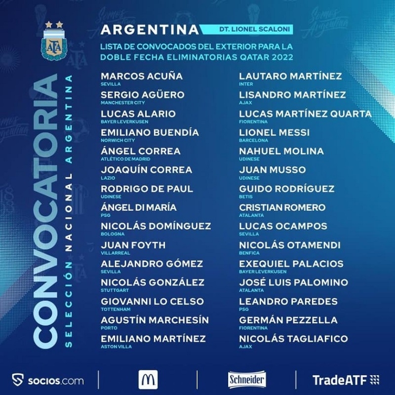 La Selección Argentina publicó este domingo la lista de convocados del exterior para la doble fecha de Eliminatorias Sudamericanas rumbo a la Copa del Mundo de Qatar 2022, en la que recibirá a Chile el 3 de junio en Santiago del Estero y visitará a Colombia el 8/6, ambos con transmisión de TyC Sports.