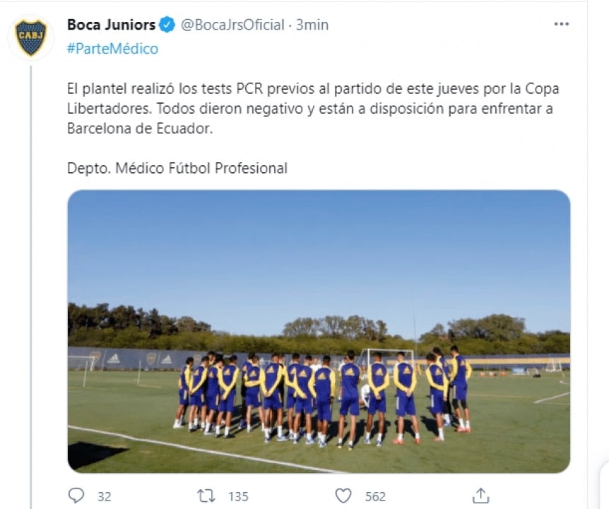 Los testeos corresponden al protocolo que exige Conmebol 48 horas antes de cada partido continental y serán claves para disipar los miedos en el conjunto azul y oro, que el jueves recibirá a Barcelona de Guayaquil en La Bombonera por la Copa Libertadores y no sufrirá ninguna ausencia por Covid-19.