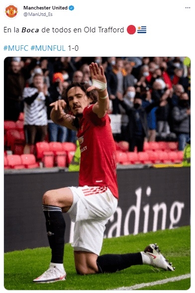 @ManUtd_Es es la cuenta de Twitter oficial en español del Manchester United. Tras el golazo del uruguayo ante Fulham, tuiteó: "En la 𝘽𝙤𝙘𝙖 de todos en Old Trafford". La indirecta no tardó en llegar a los ojos de los hinchas del Xeneize, claramente referencial a la posibilidad que existió para que Cavani jugara en Argentina con la camiseta azul y amarilla.