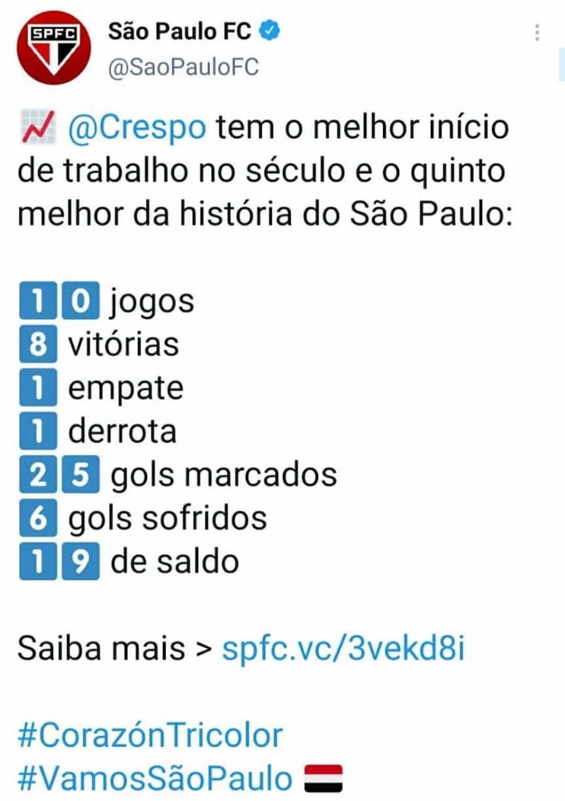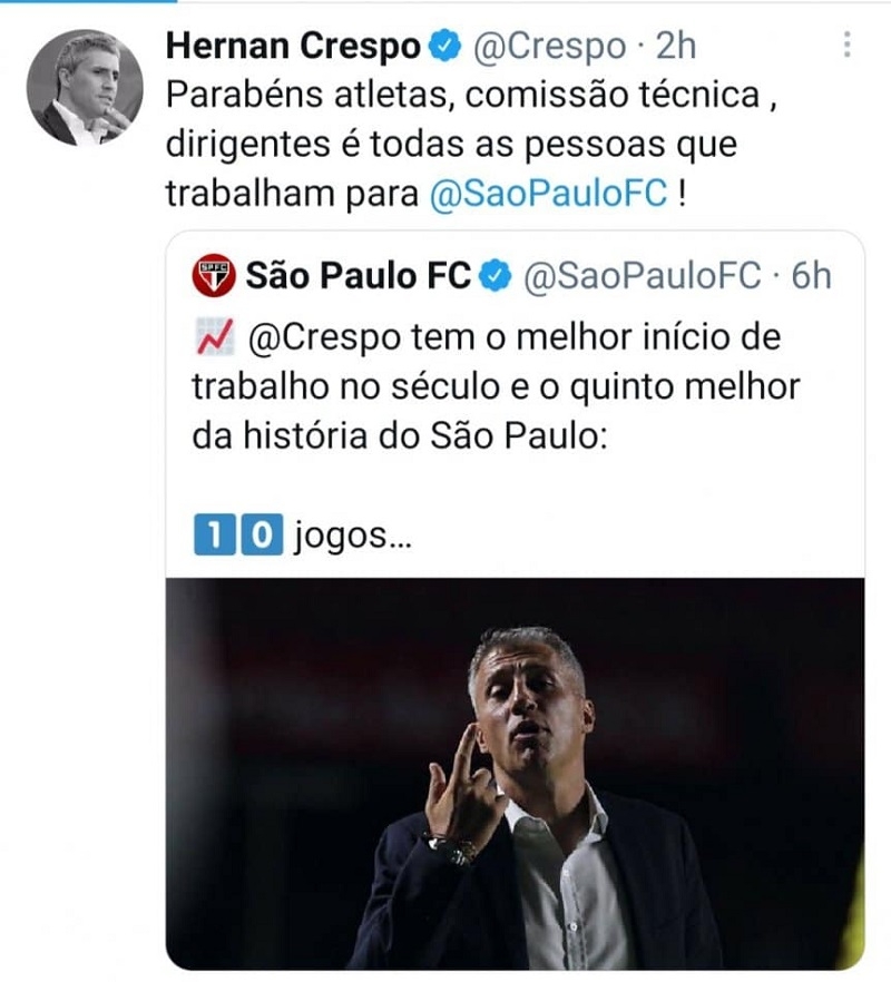 A pesar de que su trayectoria es corta todavía en el Tricolor, ya se metió en el rincón de los que serán recordados del club por haber tenido el mejor inicio en la historia del club del último siglo y el quinto mejor de la historia. En 10 partidos, los de Crespo consiguieron 8 victorias, 1 empate y 1 derrota con una suma total de 25 goles a favor y tan sólo 6 en contra, Así expresó el club brasilero el suceso en su cuenta oficial de Twitter: