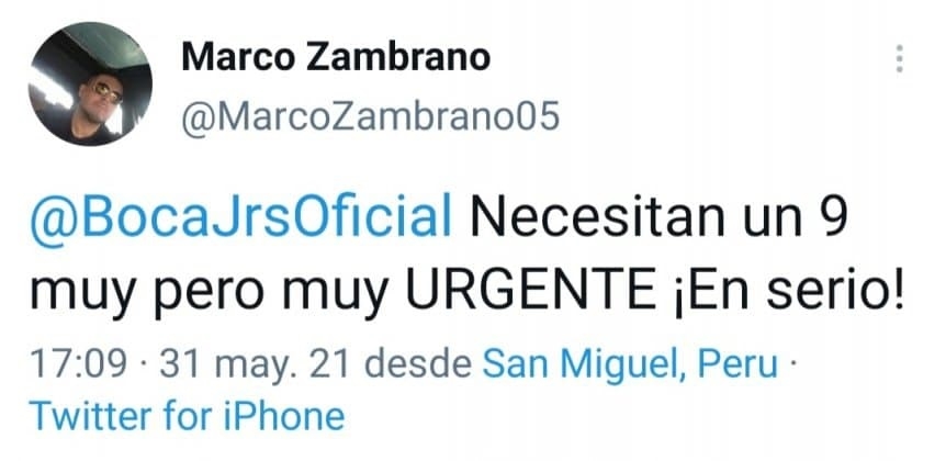 Al Xeneize se le reclama en cada partido por un mejor funcionamiento y calidad futbolística en su producción. Otro tema que resalta y hasta llega a sobresalir por los demás es la falta de un centro delantero con presencia total en el área rival. Su relevancia es tal que, luego de no conseguir el pase a la final, el hermano de Zambrano publicó un tuit que desató la polémica no precisamente por el mensaje mismo, sino porque ¡el futbolista peruano le dio like!. ¿La frase?: "Necesitan un 9 muy pero muy URGENTE ¡En serio!"