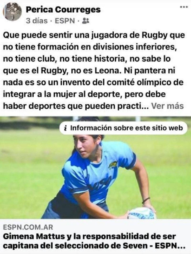 El posteo siguió ya más subido de tono y discriminatorio: «Estos dos últimos fines de semanas pude ver la mediocre competencia de 6 naciones Femenino, que decepción, mujeres poco femeninas practicando deportes que solo las habilita a ser discriminadas gorditas no o tejedoras de bufandas».