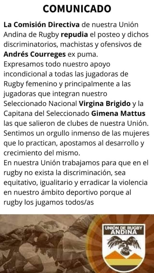 La Unión Andina de Rugby, que preside el catamarqueño Marcelo López, emitió un comunicado en repudio de las declaraciones de Andrés Courreges, exPuma, sobre el rol de la mujer en el rugby.