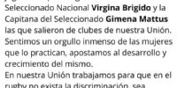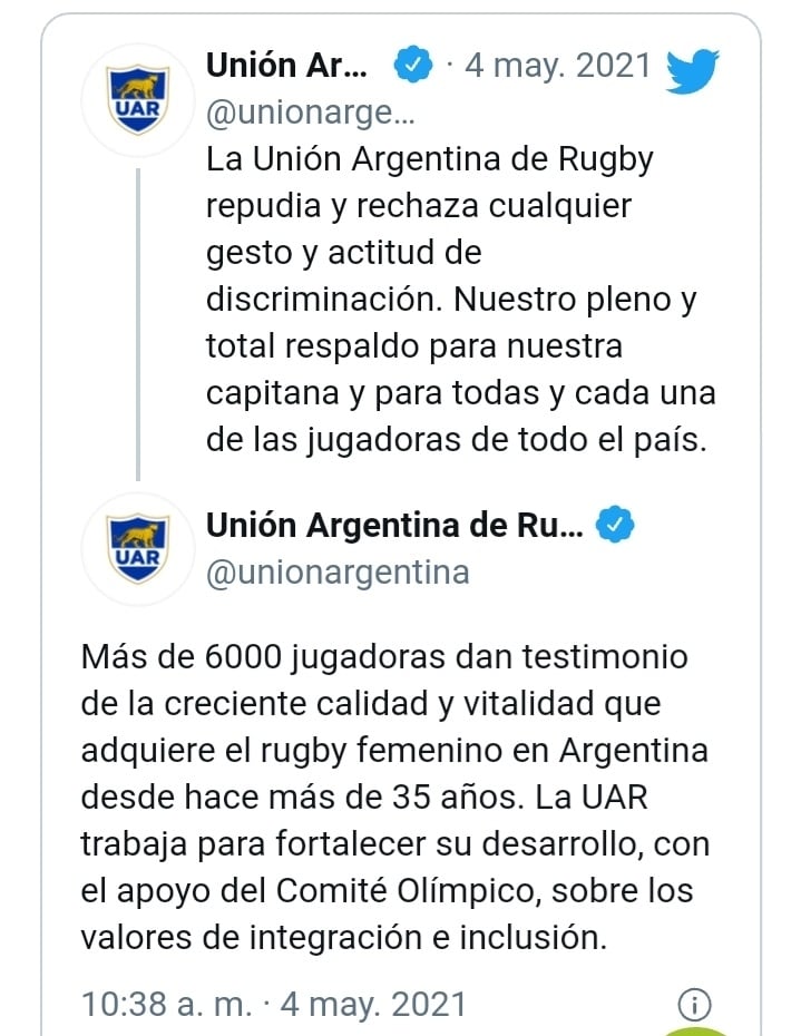 El primero en reaccionar fue a UAR que mantiene una lucha larga y mediática con Courreges. En el Twitter del ente regulador del Rugby nacional salieron a bancar al rugby femenino.
