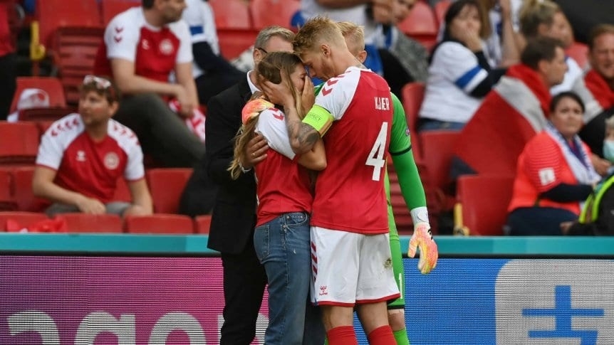 Sabrina Kvist Jensen fue consolado en el campo de juego por Simon Kjaer, defensor de la Selección de Dinamarca, mientras Eriksen era atendido por los médicos.