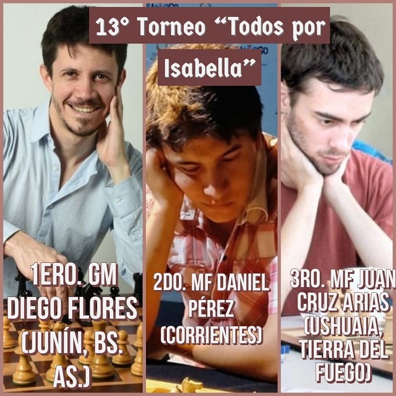 El Gran Maestro Internacional Diego Flores se llevó el 13° Torneo Solidario Todos por Isabella, quien realizó un gran torneo. Cabe señalar, que Flores es un importante colaborador y participante del evento; y está muy comprometido con la causa.