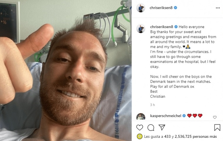 "Estoy bien, dadas las circunstancias. Todavía tengo que pasar algunos exámenes en el hospital, pero me encuentro bien", señaló en un mensaje en su cuenta en Instagram, difundido también en la cuenta oficial de la Federación Danesa (DBU).