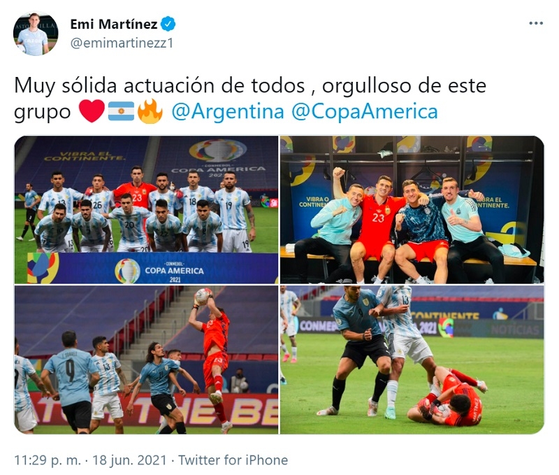 Emiliano Martínez habló este viernes en TyC Sports sobre la actuación de la Selección Argentina en su triunfo frente a Uruguay por la segunda fecha de la Copa América Brasil 2021.