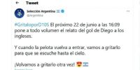 "El 22 de junio a las 16:09 poné a todo volumen el relato del gol de Diego a los ingleses. Y cuando la pelota vuelva a entrar, vamos a gritarlo para que se escuche hasta el cielo. ¡Volvamos a gritarlo otra vez!", arengó la cuenta de la Selección Argentina en Twitter e Instagram.