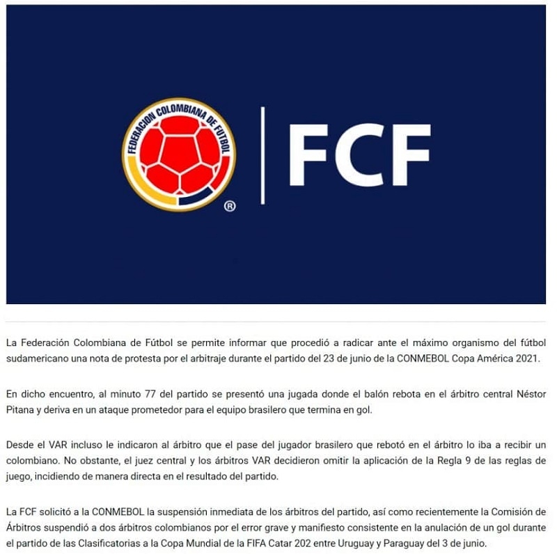 "La Federación Colombiana de Fútbol se permite informar que procedió a radicar ante el máximo organismo del fútbol sudamericano una nota de protesta por el arbitraje durante el partido del 23 de junio de la CONMEBOL Copa América 2021. En dicho encuentro, al minuto 77 del partido se presentó una jugada donde el balón rebota en el árbitro central Néstor Pitana y deriva en un ataque prometedor para el equipo brasilero que termina en gol.