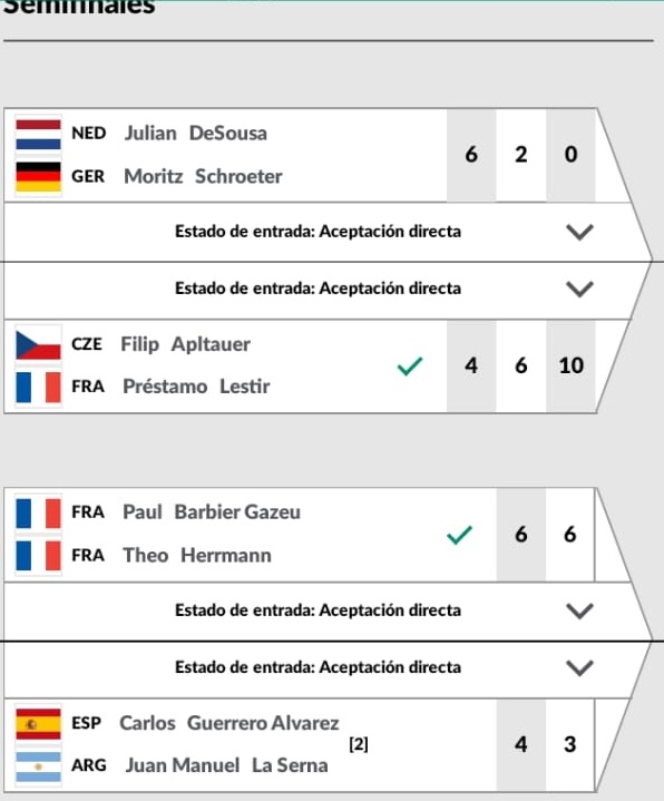 Por el marcador de 6/4 y 6/3, La Serna/Guerrero Álvarez perdieron frente a dupla francesa conformada por Paul Barbier Gazeu y Theo Herrmann, que ahora se enfrentarán con la pareja integrada por el checo Filip Apltauer y el francpes Préstamo Lestir.