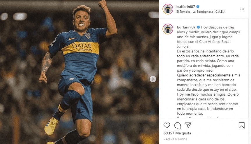 A su vez, Buffa le agradeció a sus compañeros y a los empleados del club. Y también le dedicó palabras especiales para los fanáticos: "Mi cariño eterno y agradecimiento a todos los hinchas Xeneizes por el amor, respeto y apoyo incondicional que me han brindado siempre, desde aquel día que pisé el césped de la mítica Bombonera por primera vez".