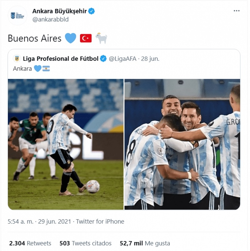 El municipio de Ankara, capital de Turquía, se prendió en la movida del nuevo apodo de Lionel Messi y citó un tweet de la Liga Profesional Argentina con el apodo de la Pulga y una mención a Buenos Aires, a modo de curiosidad.