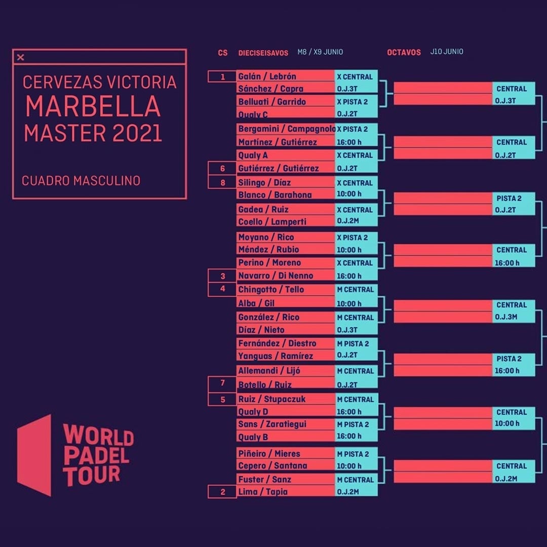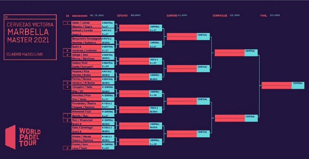La estructura del Cervezas Victoria Marbella Master es un poco diferente a los torneos celebrados esta temporada. El hecho de tratarse de un torneo Master hace que la jornada de dieciseisavos se dispute en 2 jornadas, martes y miércoles.