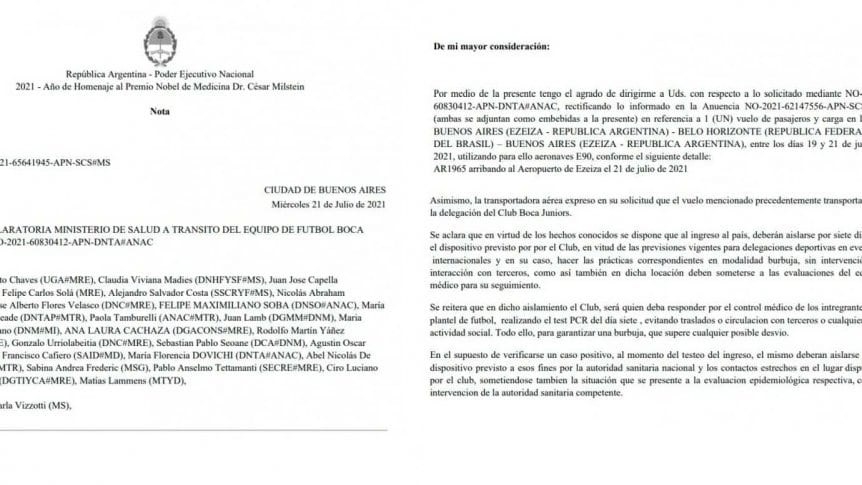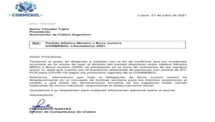 Boca trae una carta firmada por el Cónsul y Conmebol, en la que queda expresado que el plantel no rompió ninguna burbuja en Belo Horizonte.