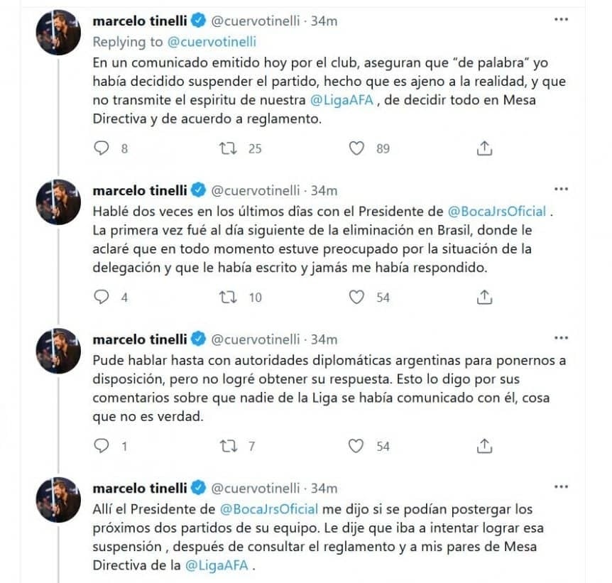 Como Presidente de la Liga Profesional quería contarles lo sucedido en relación al tema de Boca y su pedido, que ingresó en el día de hoy a última hora a la Liga, para postergar su partido del fin de semana frente a Banfield y el martes con San Lorenzo.