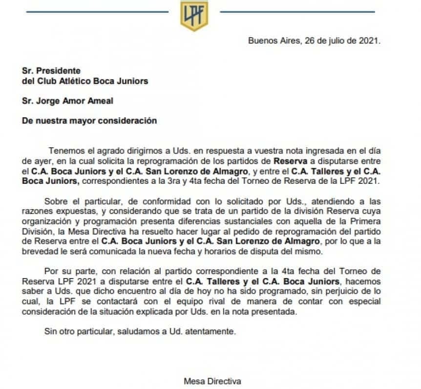 Lo único que la Liga Profesional de Fútbol le aceptó al Xeneize fue postergar el partido de Reserva que mañana también debían jugar Boca y San Lorenzo. En tanto, se indicó que el duelo de la siguiente jornada de la misma categoría frente a Talleres todavía no tiene programación fijada.
