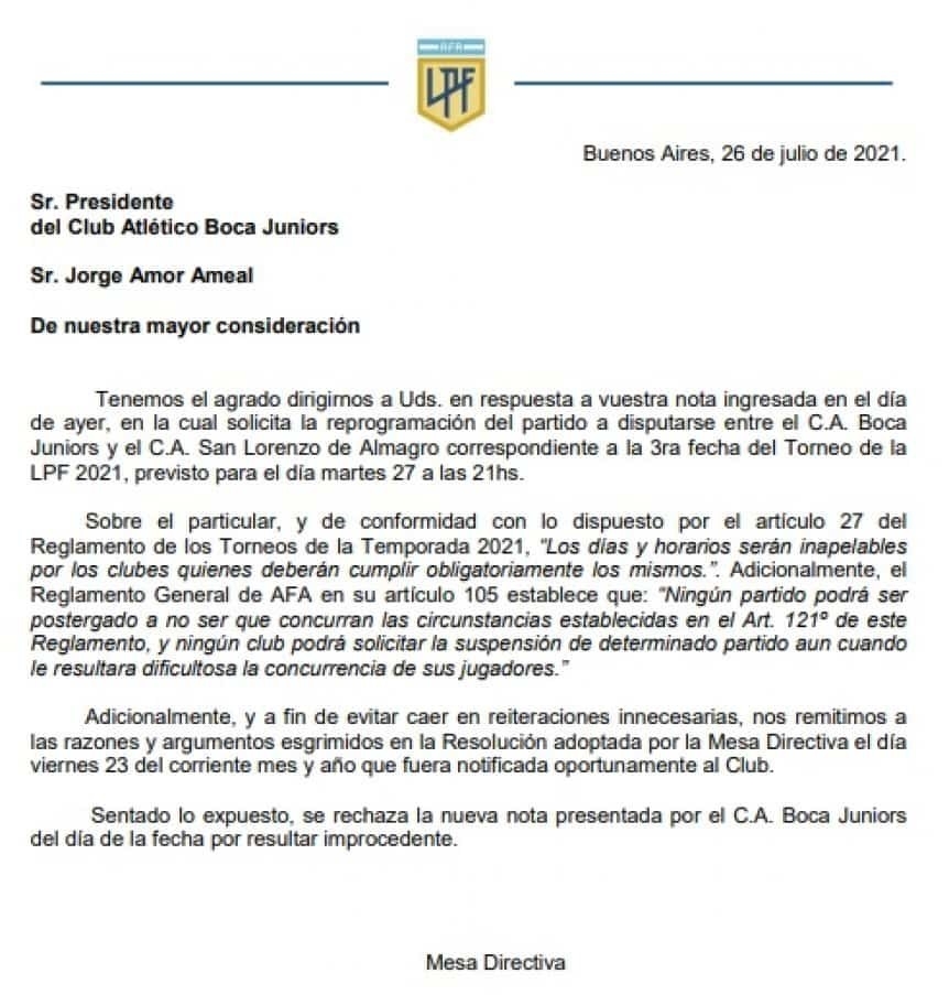 La Liga Profesional de Fútbol rechazó esta tarde el pedido de Boca para postergar el partido ante San Lorenzo, que se jugará mañana a las 21 en la Bombonera. De esta manera, el Xeneize deberá presentarse nuevamente con los jugadores de la Reserva.
