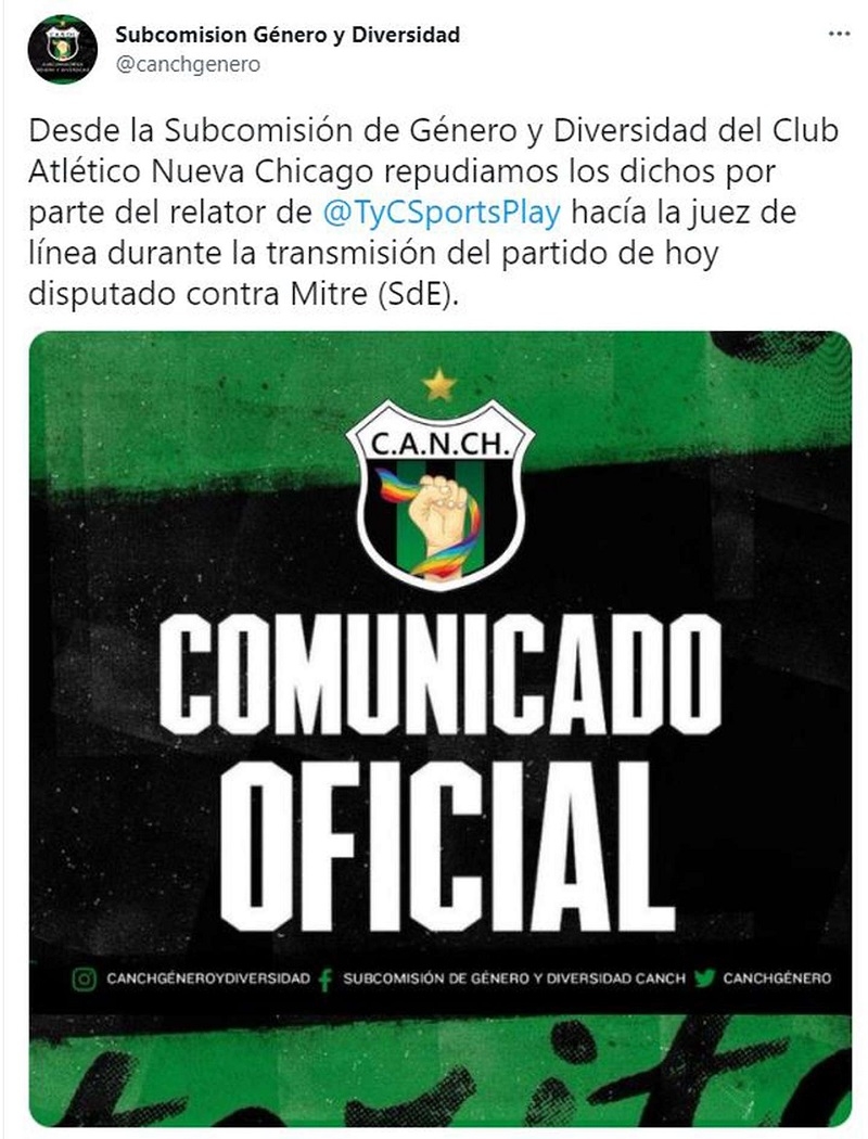 También se manifestó la Subcomisión de Género y Diversidad de Nueva Chicago que repudió “los dichos por parte del relator de @TyCSportsPlay hacía la juez de línea durante la transmisión del partido de hoy disputado contra Mitre (SdE)".