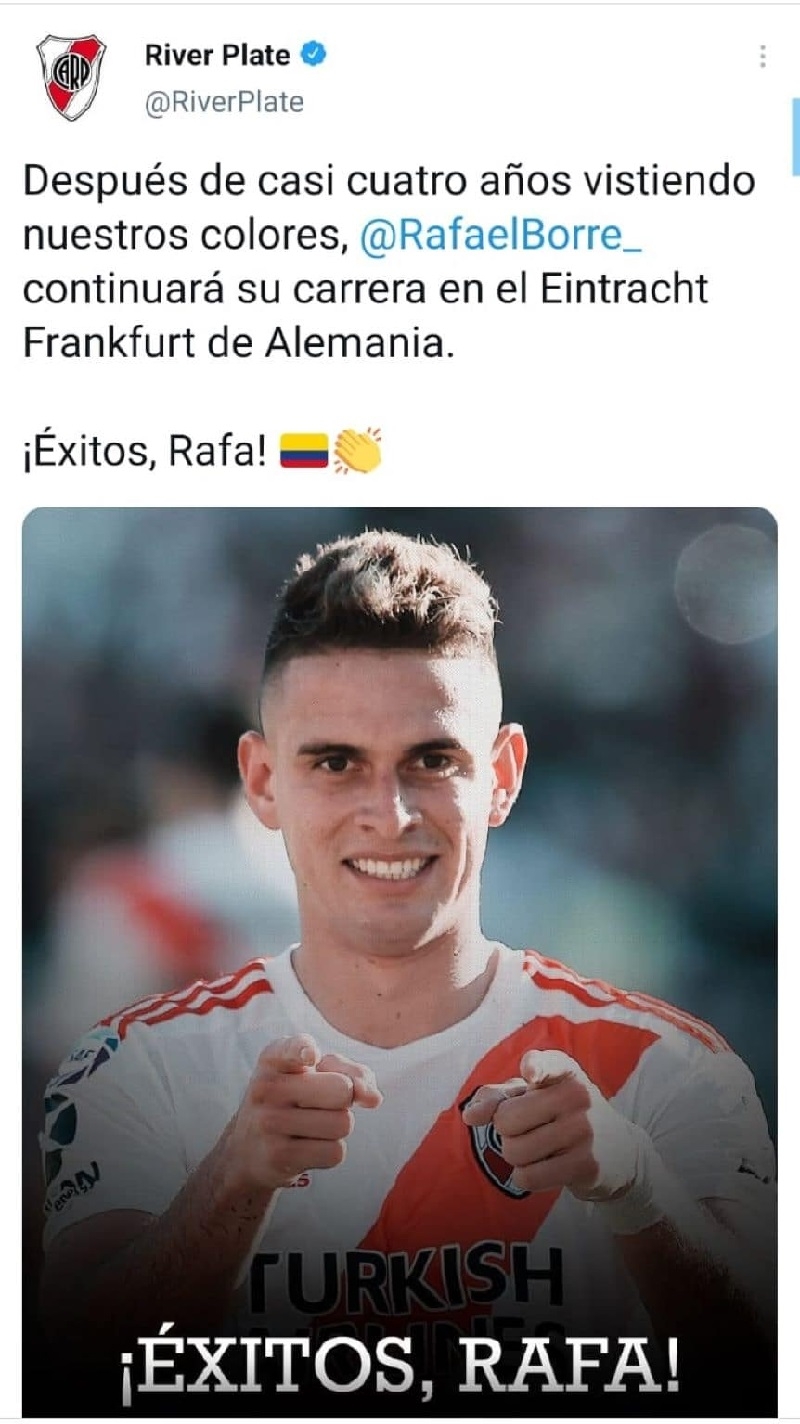 El conjunto de Núñez se despidió del futbolista que actualmente se encuentra disputando la Copa América 2021 con Colombia, que se enfrentará a la Selección Argentina este martes desde las 22 por la semifinal. "Después de casi cuatro años vistiendo nuestros colores, Rafael Borré continuará su carrera en el Eintracht Frankfurt de Alemania. ¡Éxitos, Rafa!", escribió el club.