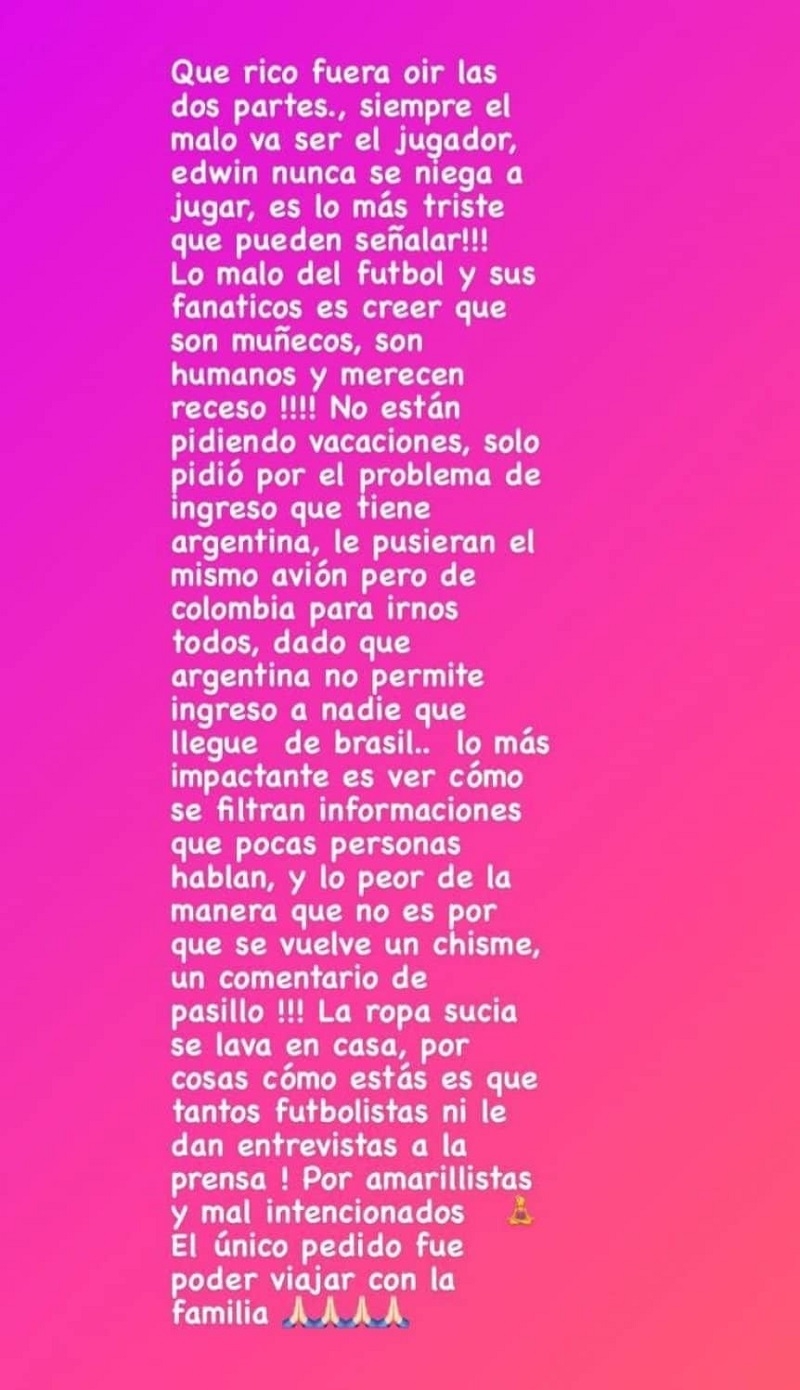 "Que rico fuera oír las dos partes. Siempre el malo va a ser el jugador. Edwin nunca se niega a jugar, ¡¡¡es lo más triste que pueden señalar!!! Lo malo del fútbol y sus fanáticos es creer que son muñecos. ¡¡¡Son humanos y merecen receso!!!", comenzó diciendo la pareja de Cardona en un testamento publicado en sus historias de Instagram.