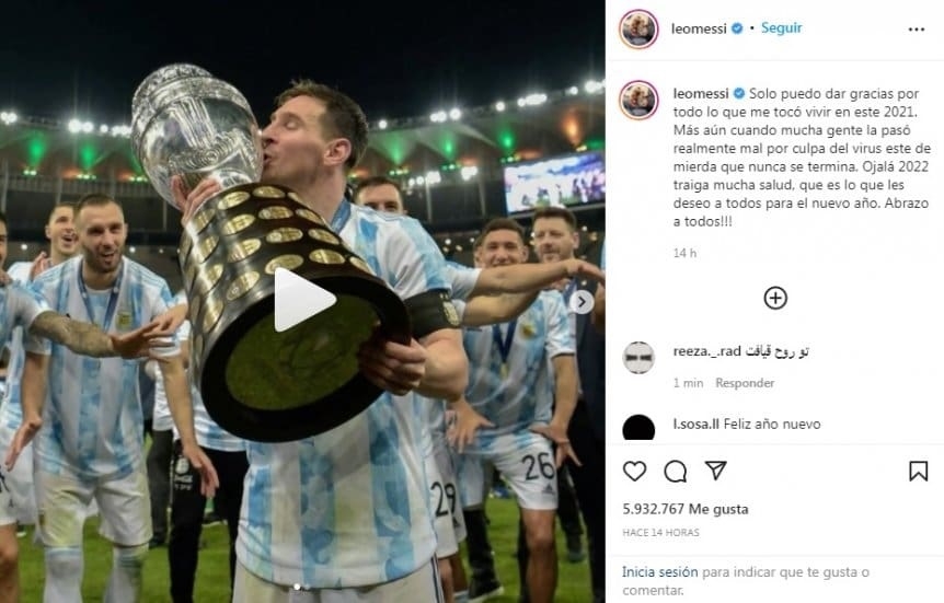 "Solo puedo dar gracias por todo lo que me tocó vivir en este 2021. Más aún cuando mucha gente la pasó realmente mal por culpa del virus este de mierda que nunca se termina. Ojalá 2022 traiga mucha salud, que es lo que les deseo a todos para el año nuevo. Abrazo a todos!!!", escribió Messi en su Instagram.