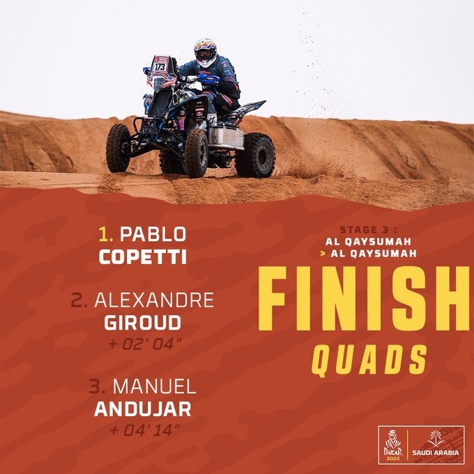 El argentino-estadounidense Pablo Copetti ganó este martes la tercera etapa del Dakar 2022; y ante el abandono del lituano Laisvydas Kancius, es el nuevo líder de la clasificación general. El piloto nacido en Córdoba y radicado después en San Martín de los Andes antes de residir en los Estados Unidos le sacó 2 minutos y 4 segundos a Alexande Giroud. El francés es su escolta en el global, a 15 minutos y 29 segundos.