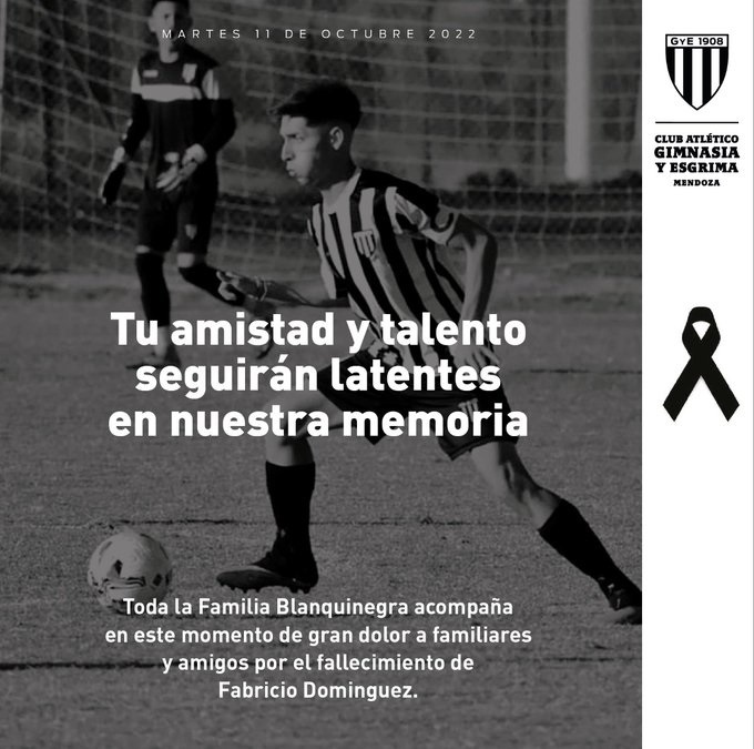 El fútbol mendocino está de luto por el fallecimiento de Fabricio Domínguez, juvenil de Gimnasia que el martes pasado recibió una descarga eléctrica en una cancha de césped sintético en Godoy Cruz.