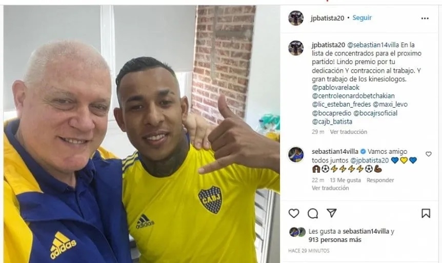 Jorge Batista, médico del plantel de Boca, celebró la convocatoria de Sebastián Villa. "Lindo premio por tu dedicación Y contracción al trabajo. Y gran trabajo de los kinesiologos", expresó en una publicación en Instagram.