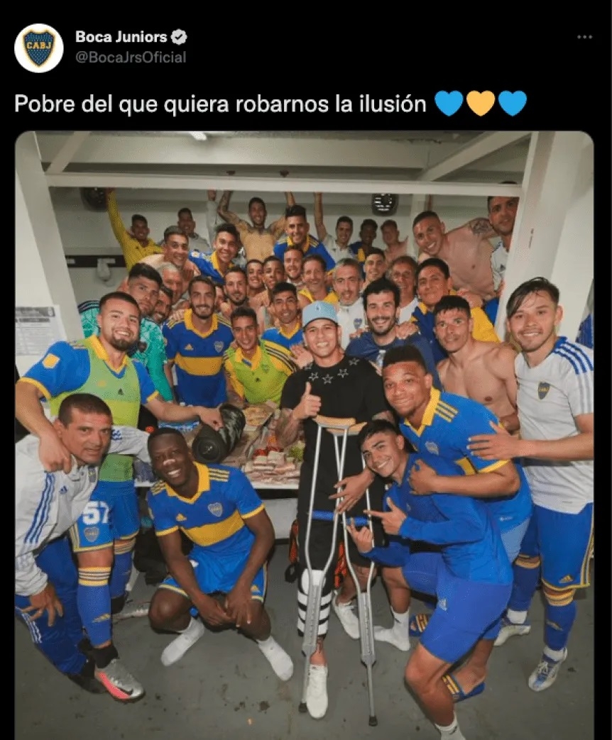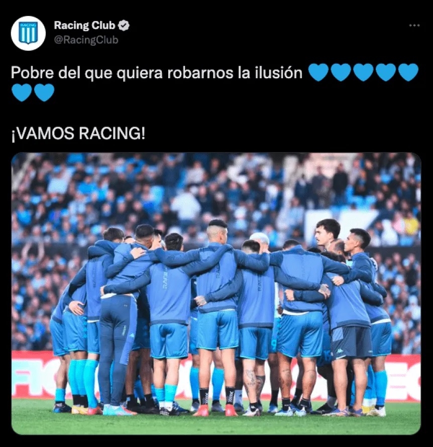"Pobre del que quiera robarnos la ilusión...", escribió la cuenta oficial de Twitter de Boca para acompañar una foto de todo el plantel del Xeneize junto a todo el cuerpo técnico y el staff que los acompaña día a día. Sin embargo, la frase llamó poderosamente la ilusión ya que Racing suele utilizarla como lema de guerra, tras una vez que Enzo Copetti la subió a su cuenta de Instagram.