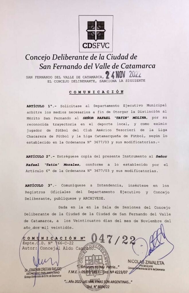 En la oportunidad, Molina recibió la distinción al “Merito San Fernando”, establecido por la Ordenanza N° 3677/03 y sus modificatorias, y que, en su caso, correspondió a la iniciativa del concejal Aldo Cancino.