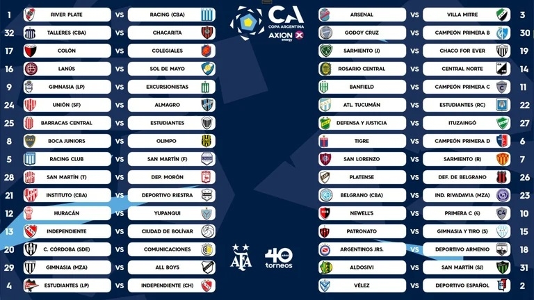 All Boys será rival de Gimnasia y Esgrima de Mendoza; Villa San Carlos o Defensores Unidos de Zárate serán el posible cruce de Godoy Cruz de Mendoza; Aldosivi se medirá ante San Martín de San Juan y Talleres jugará ante Chacarita Juniors.