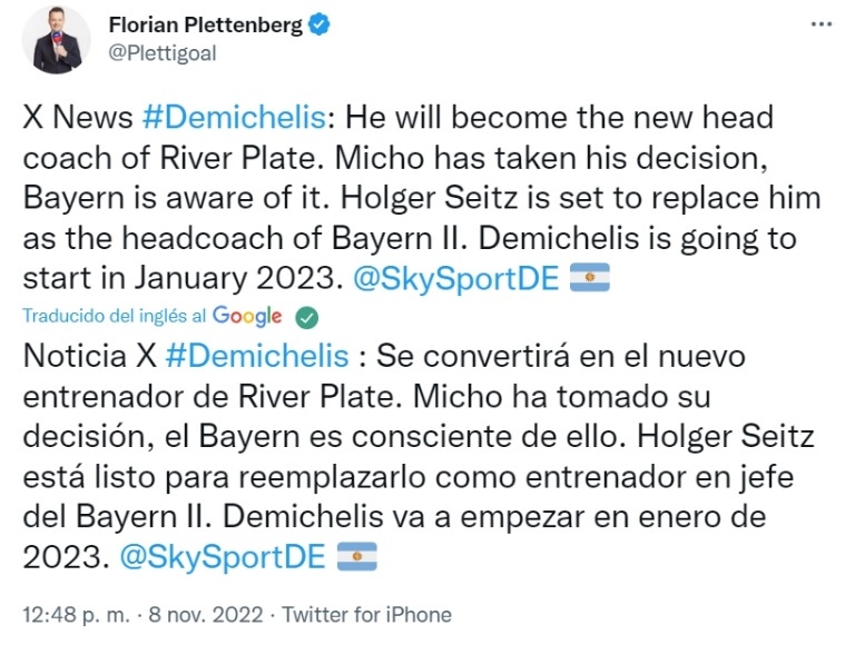 Según el periodista alemán Florian Plettenberg, el club bávaro ya habría conseguido un nuevo DT para su Reserva dada la salida del exdefensor: "Demichelis se convertirá en el nuevo entrenador de River. Micho ha tomado su decisión, el Bayern es consciente de ello. Holger Seitz está listo para reemplazarlo como entrenador en jefe del Bayern II. Demichelis comenzará en 2023", escribió en Twitter.