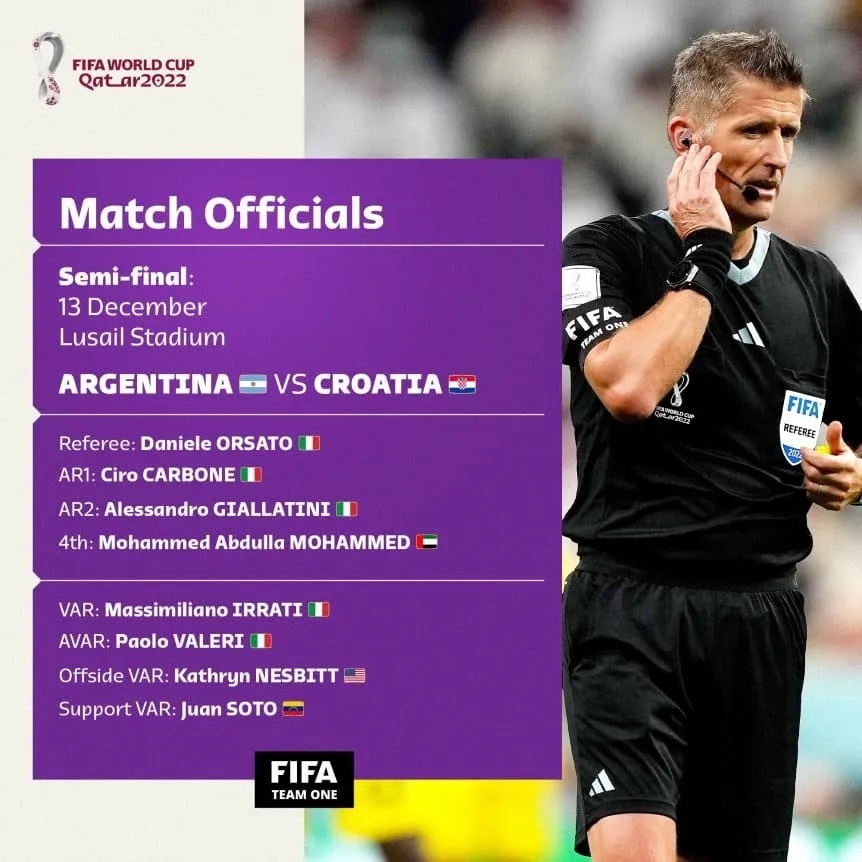 La FIFA confirmó este domingo al árbitro para la semifinal del Mundial de Qatar 2022 entre la Selección Argentina y Croacia en el estadio Lusail. Se trata del italiano Daniele Orsato, un viejo conocido para Lionel Scaloni, ya que lo dirigió en la segunda fecha del Grupo C contra México.