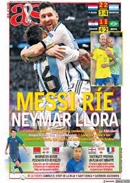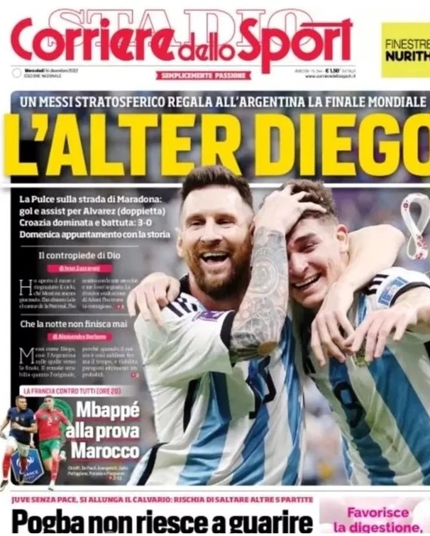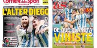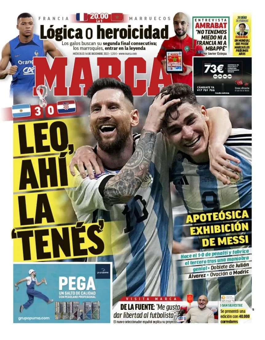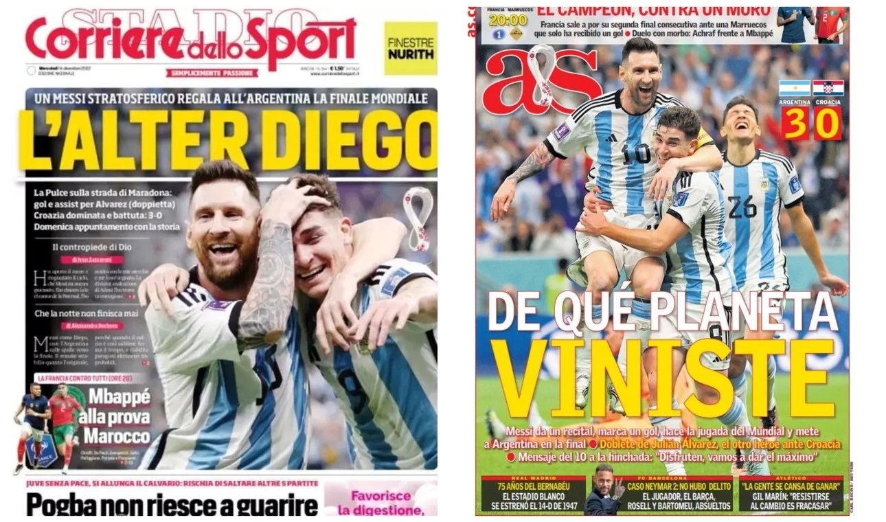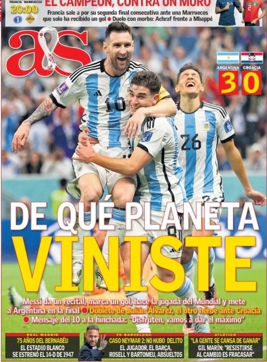 El AS, diario deportivo de Madrid, titulo su portada “De que mundo viniste” (parafraseando al “barrilete cósmico” de Víctor Hugo Morales, relatando el segundo gol -de apilada- de Diego Maradona a los ingleses en México ’86), con la foto de Messi abrazando a Julián Álvarez en el tercer gol argentino a Croacia.