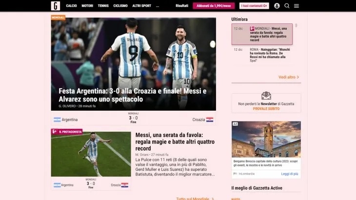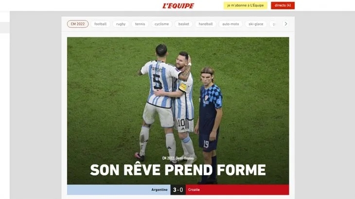 "Su sueño toma forma", tituló L'EQUIPE también de Francia que destacó la forma en la que Argentina llevó el partido: "Gracias a la eficiencia de Lionel Messi y Julián Álvarez, Argentina ganó fácilmente su semifinal de la Copa del Mundo contra Croacia el martes (3-0) y llegó a la final por sexta vez en su historia".