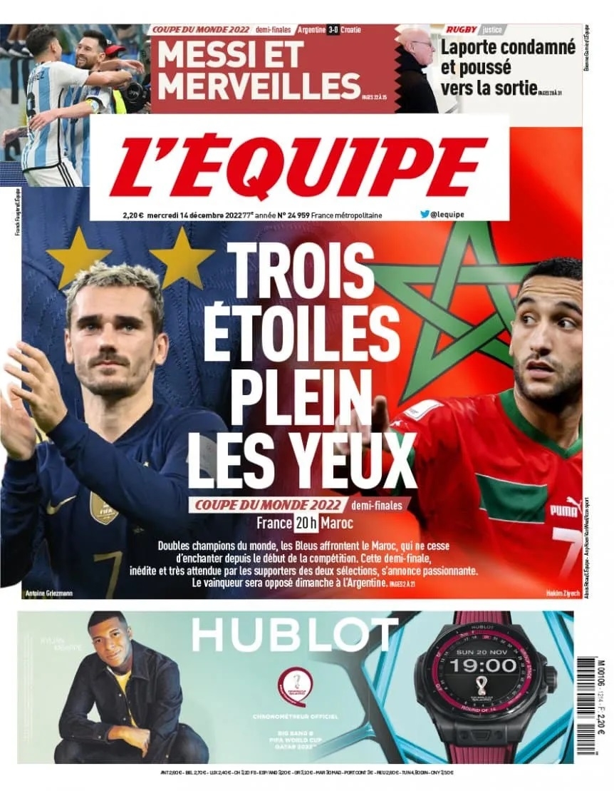 Por su parte, Le Figaro (Francia) señaló: "Mundial: La Argentina de Messi espera a Francia o Marruecos en la final"; mientras que en la bajada señalan que el 10 argentino "volvió a llevar a su país a la final de la Copa del Mundo".