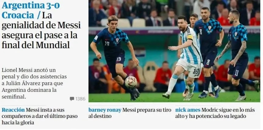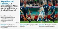 "Argentina golea a Croacia y se clasifica a la final del mundo", tituló El País mientras que en la bajada señaló que la Selección "funde a la Croacia de Modric" y destaca el "gran partido del genio rosarino".