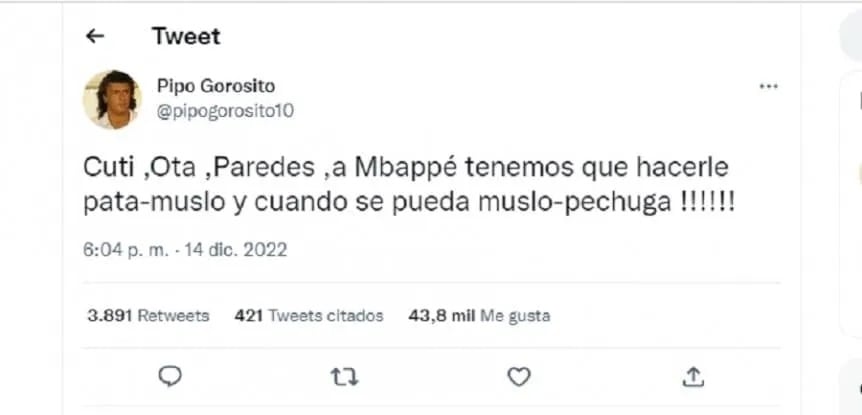 "¡Y, cuando se pueda, muslo-pechuga!", sentenció Pipo Gorosito en sus redes sociales, en una publicación que llamó la atención de todos sus seguidores, en medio de la expectativa por la gran final del Mundial de Qatar 2022 entre la Selección Argentina y Francia.
