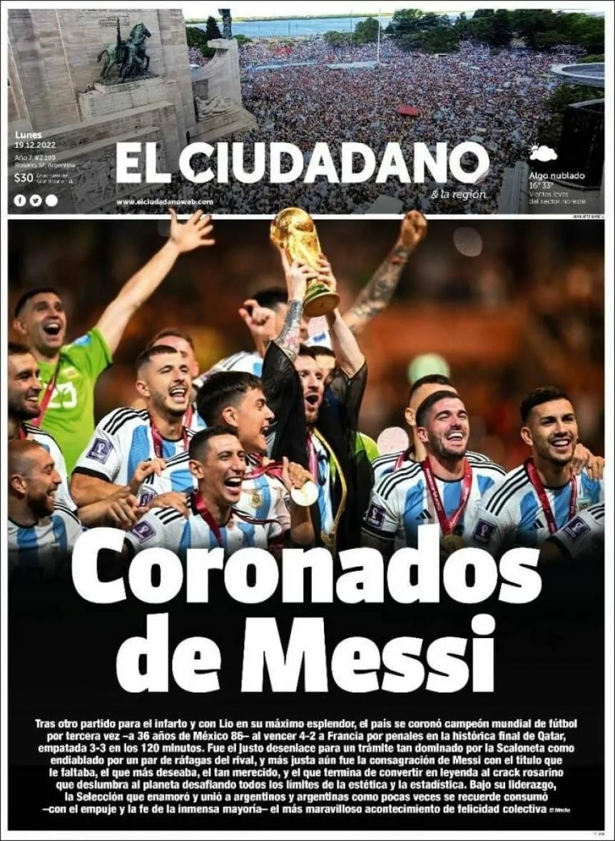 Uno de los que más innovó fue El Ciudadano, diario de Santa Fe provincia que vio nacer al astro rosarino, que tituló: "Coronados de Messi". Que además también agregó una pequeña foto de los festejos en el Monumento a la Bandera de Rosario.