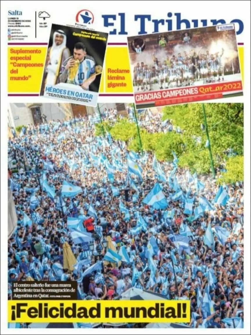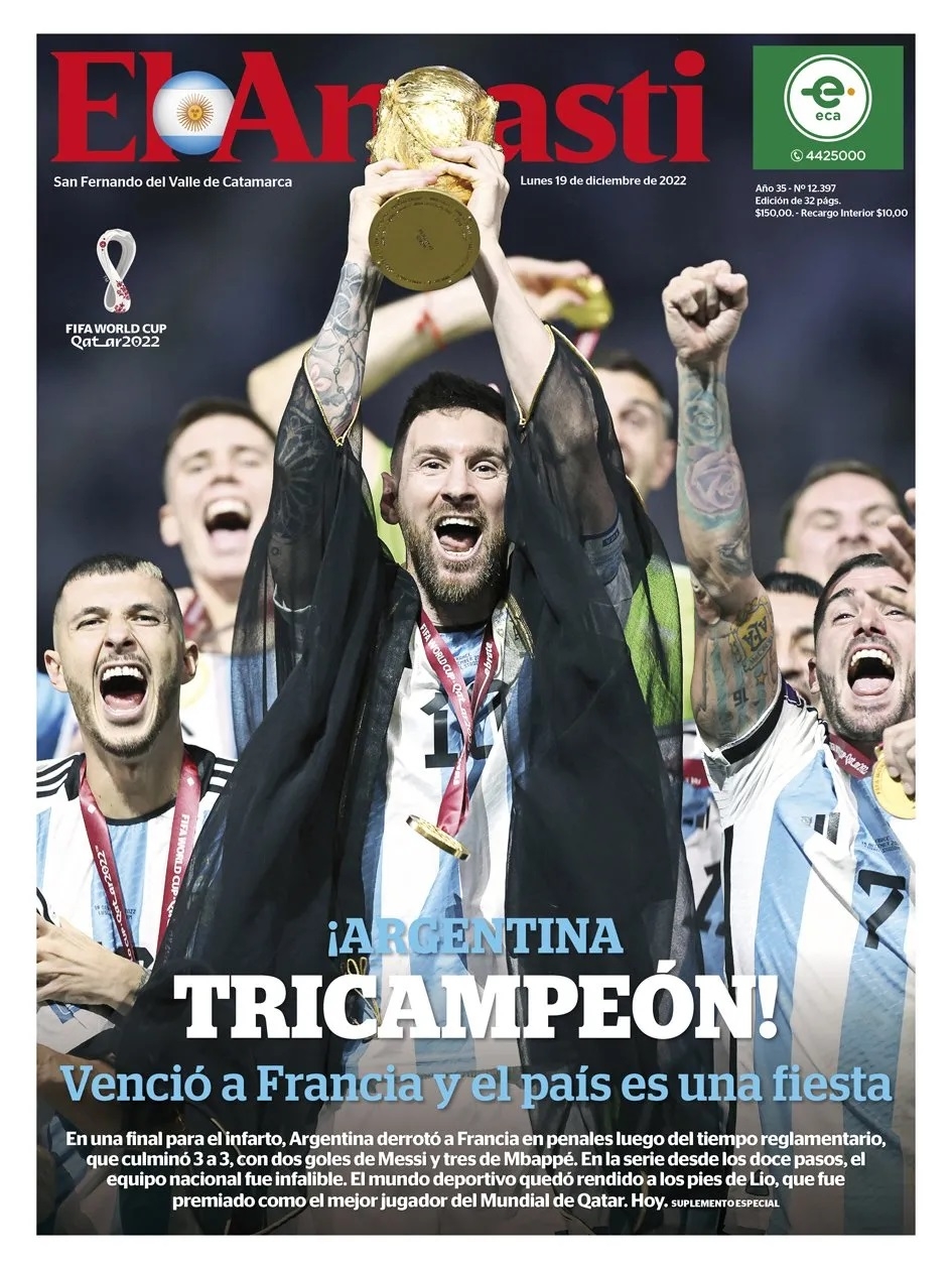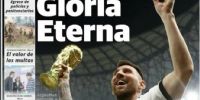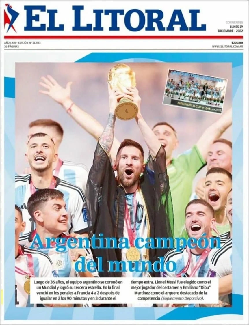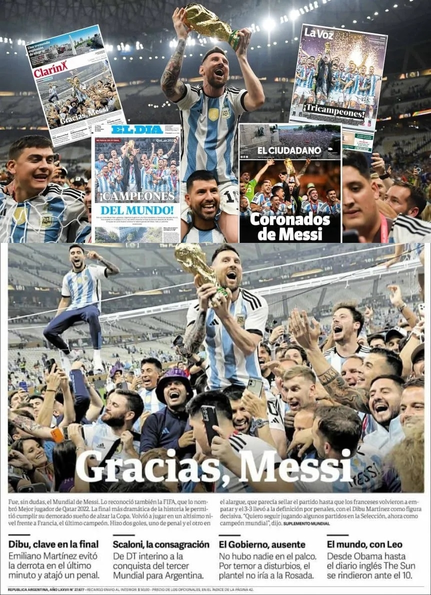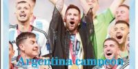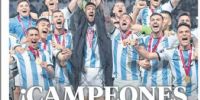 La prensa argentina obviamente amaneció este lunes con sus tapas prácticamente 'pintadas' de celeste y blanco. Desde distintos ángulos o momentos, la imagen central que se repite en casi todos los medios es la de Leo levantando la Copa, junto a titulares como "Campeones", "Campeones del Mundo" o "Tricampeones".